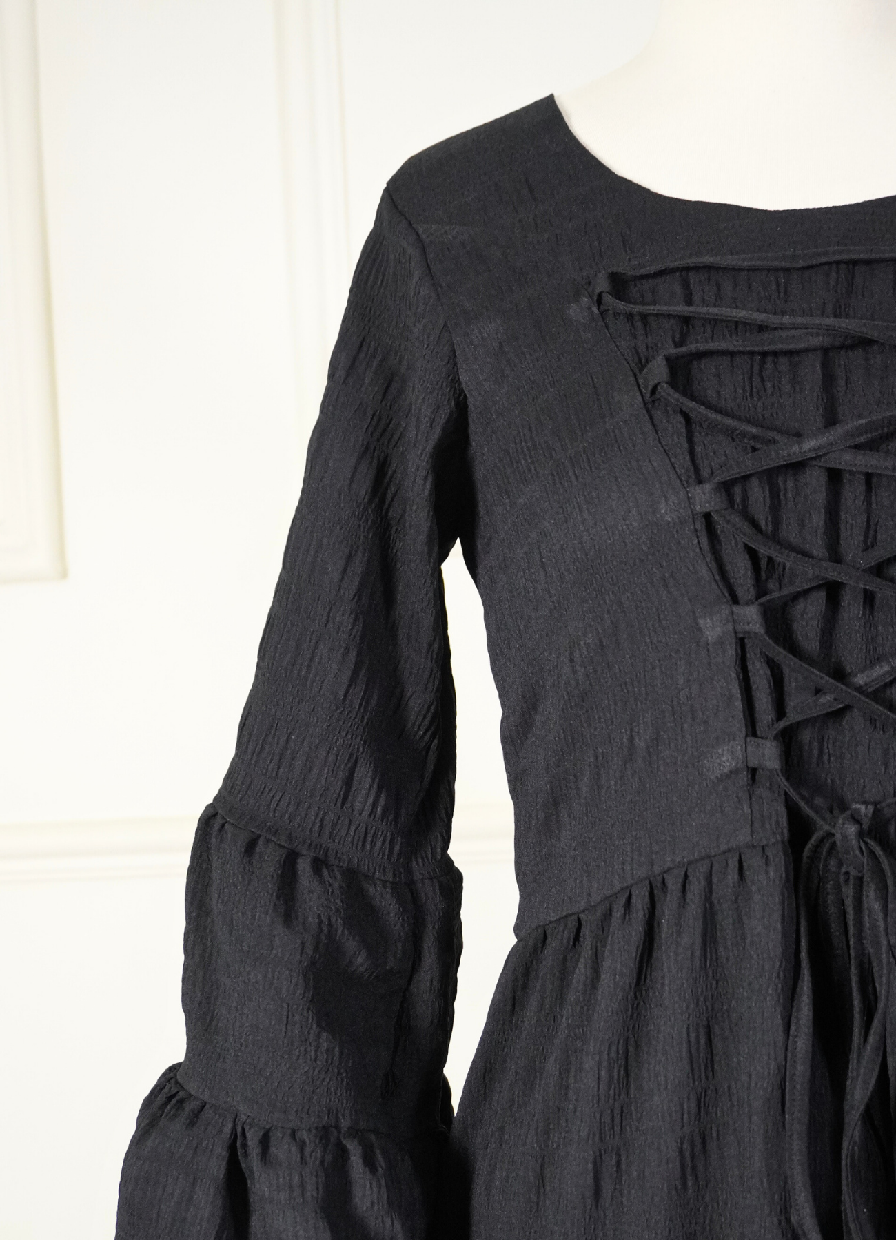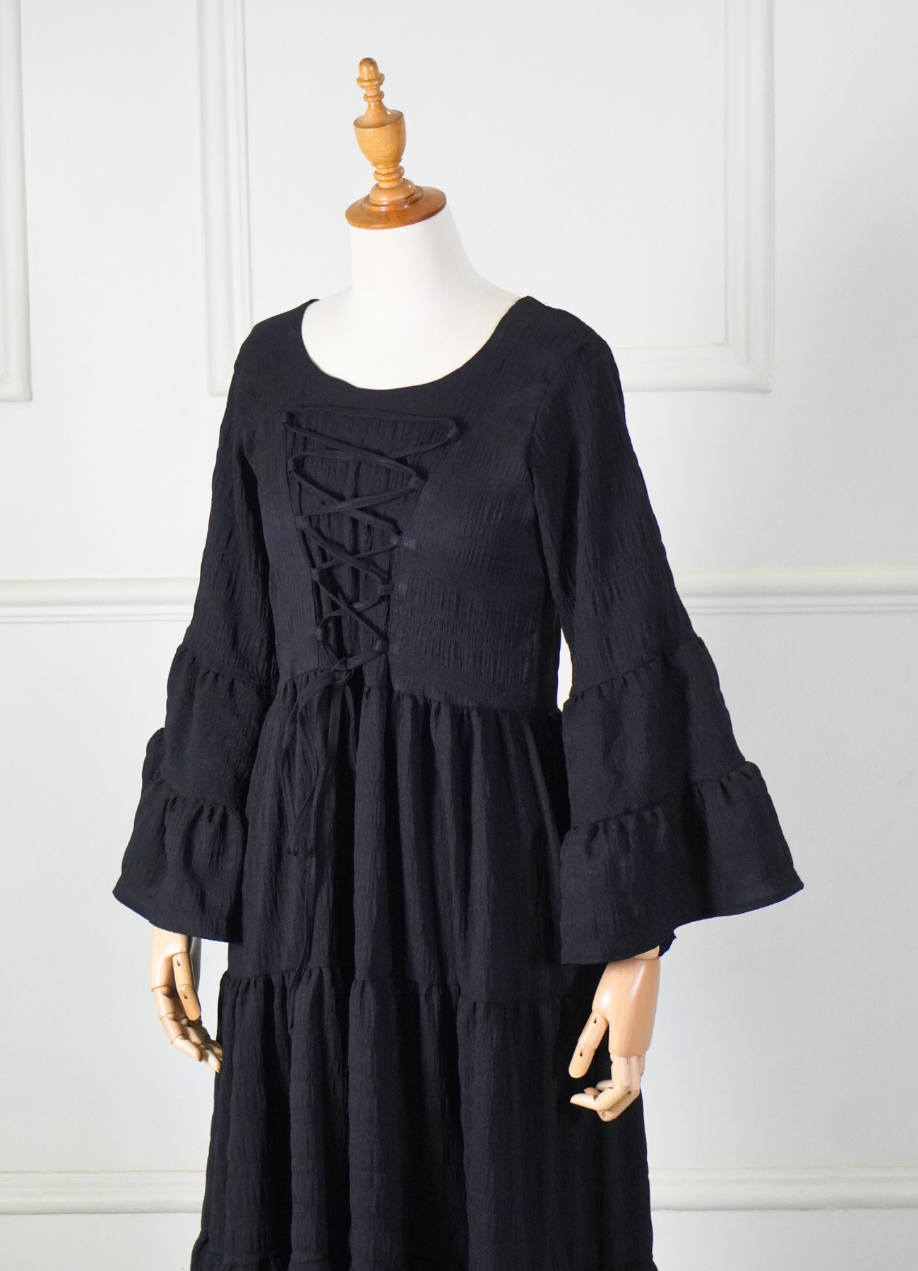 A timeless, classic design with a graceful tie-neck detail and soft flared sleeves that add movement and elegance. The beautifully flowing silhouette is enhanced by generous flaring from top to hem, creating a regal and effortless drape.