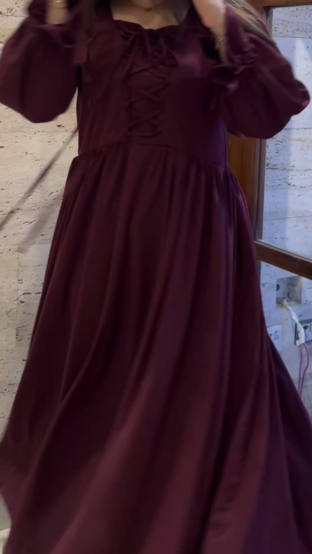 Embrace the allure of dark romance with this dramatic maxi dress, crafted in a rich, velvety mulberry hue. The design is anchored by a sharp square neckline and cinched by a defining lace-up bodice detail that flatters the waist. Statement puffed sleeves add a touch of timeless flair, balancing the long, flowing silhouette with irresistible drama.